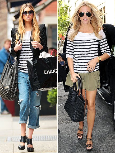 Whitney Port pairs her Alice + Olivia sequined top with ripped jeans and a blazer for shopping in the Big Apple, while the model pairs her striped shirt with a khaki skirt while in N.Y.C.